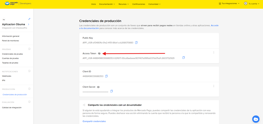 9. Finalmente, se muestran las credenciales de producción. En este caso vamos a utilizar el Access Token.