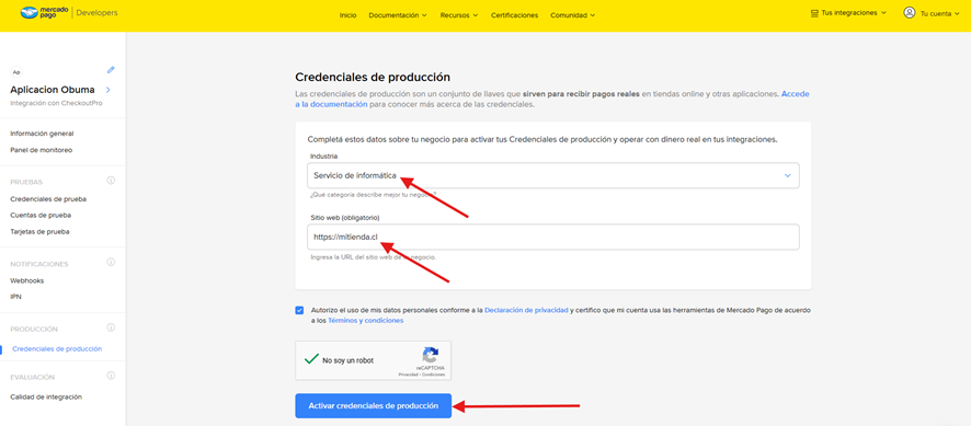 8. Se mostrará la siguiente interfaz donde primero selecciona la industria de su negocio e ingresa el sitio web de su tienda. Después acepta la Declaración de Privacidad y Términos y condiciones. Luego, haz clic en Activar credenciales de producción.