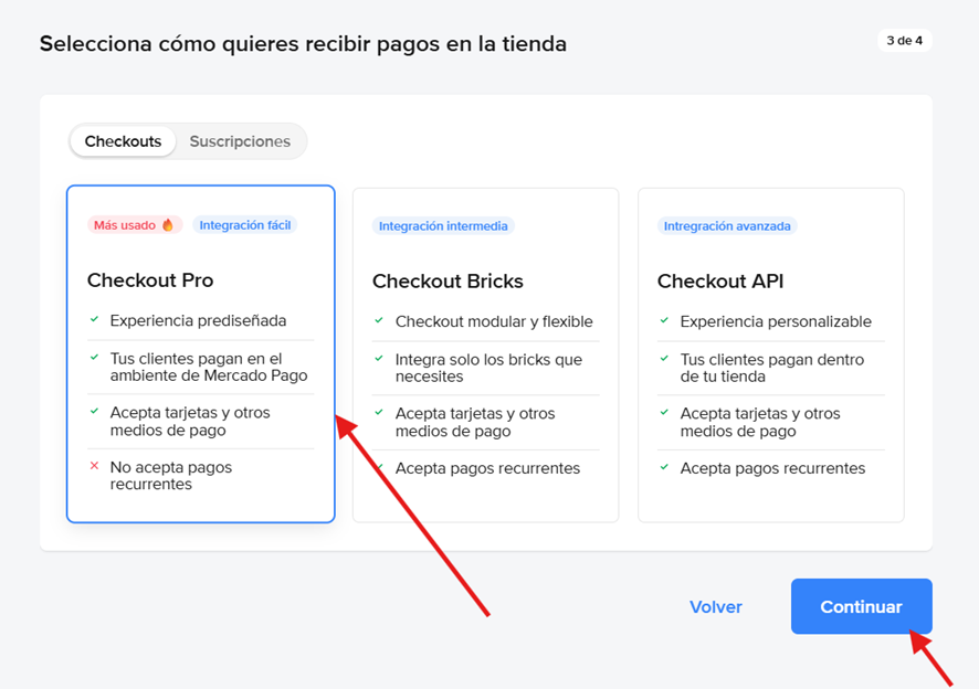 5. Ahora seleccionas cómo quiere recibir pago en la tienda, para ello selecciona Checkout Pro, después clic en Continuar.
