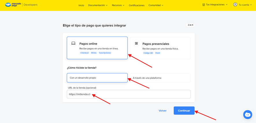 4. Ahora se muestra la siguiente interfaz donde, en tipo de pago, seleccionas Pago online. Luego, en ¿Cómo hiciste la tienda? Seleccionas Con un desarrollo propio y en URL de tienda ingresas la URL de tu tienda. En este caso por ejemplo, https://mitienda.cl. Por último, clic en Continuar.
