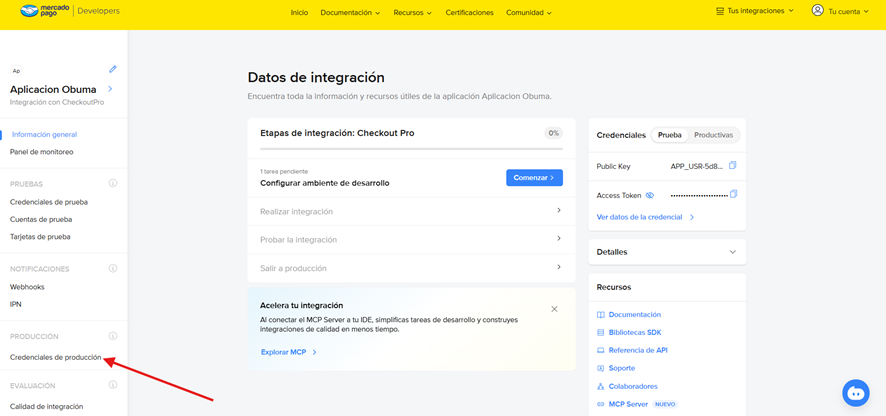 https://www.obuma.es/ayuda/articulo/773/como-generar-las-credenciales-de-mercado-pago-para-integrar-checkout-pro-como-medio-de-pago-en-tu-tienda-ecommerce-obuma-shopsEn sección se explicará como generar las credenciales de Mercado Pago para integrar Checkout Pro como medio de pago en tu tienda ecommerce Obuma Shops. Al finalizar esta guía, tendrás las credenciales de producción listas para configurar Mercado Pago como medio de pago en tu tienda ecommerce y comenzar a recibir pagos de forma segura.
