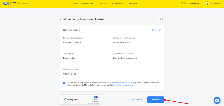 El Access Token que se genere en Mercado Pago debe corresponder a la cuenta donde se recibirán todos los pagos realizados en la tienda ecommerce Obuma Shops. Es decir, todos los pagos efectuados a través de Checkout Pro se acreditarán en la cuenta de Mercado Pago con la que se creó la aplicación y se generaron las credenciales.